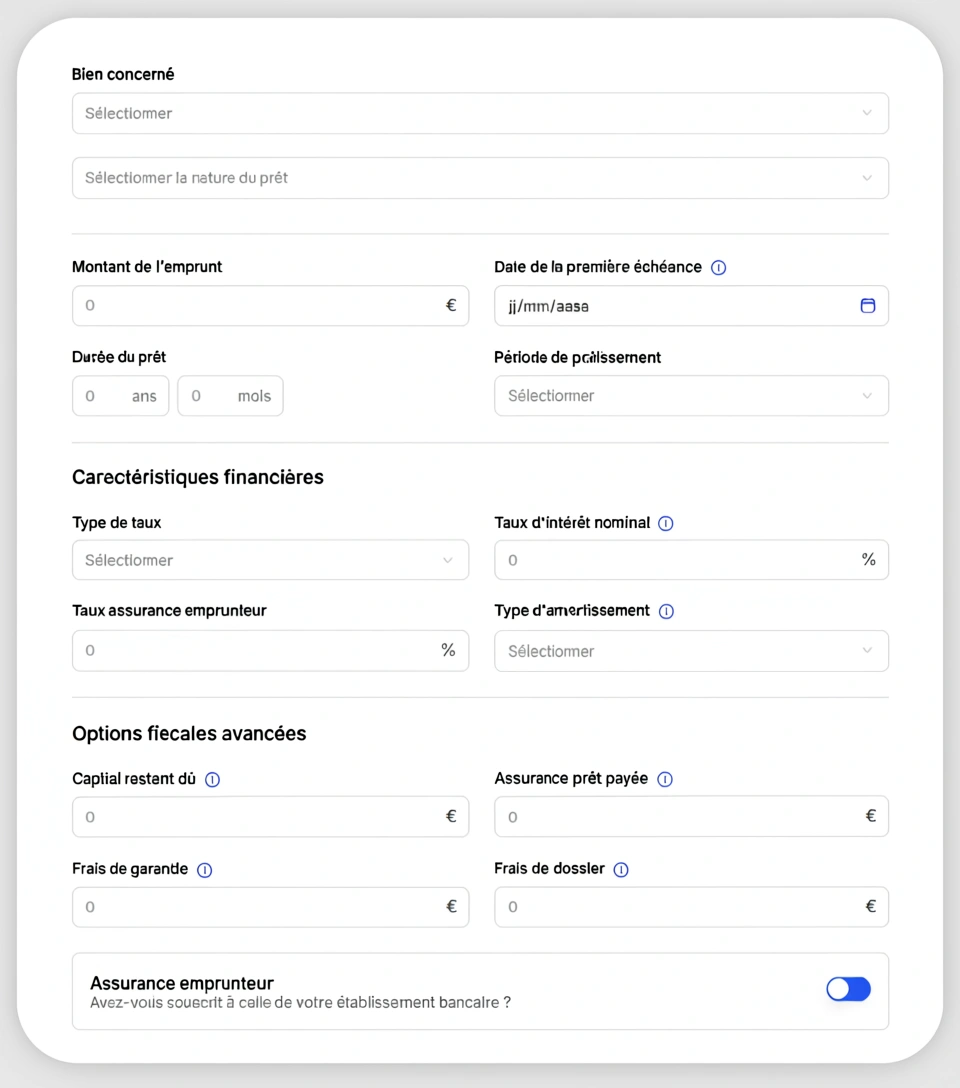 Centralisez toutes les informations relatives à vos emprunts : montant, durée, taux, assurance, et échéancier. Le module calcule automatiquement vos intérêts déductibles et met à jour votre résultat fiscal LMNP.