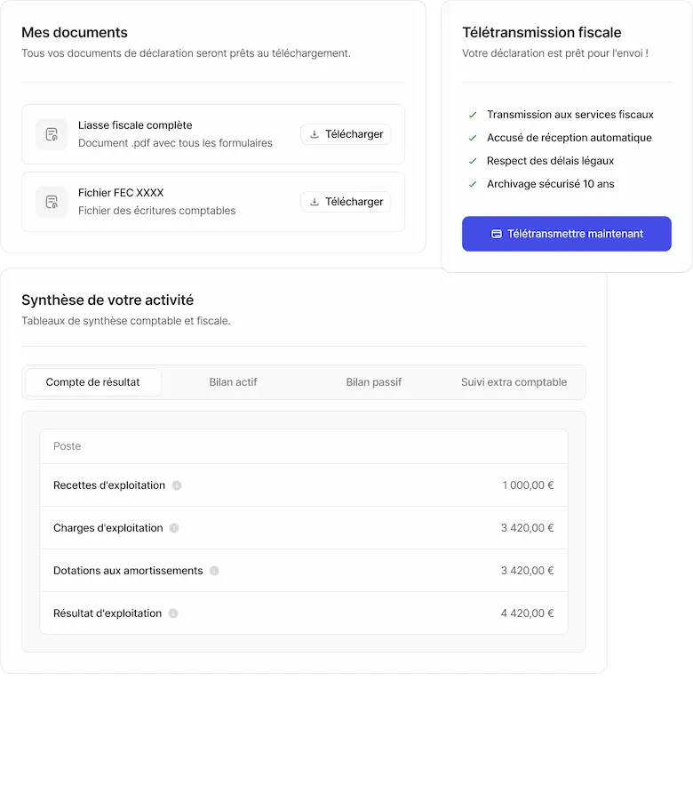 Déclarez vos recettes, suivez vos charges et gérez votre fiscalité avec une interface simple et conforme.